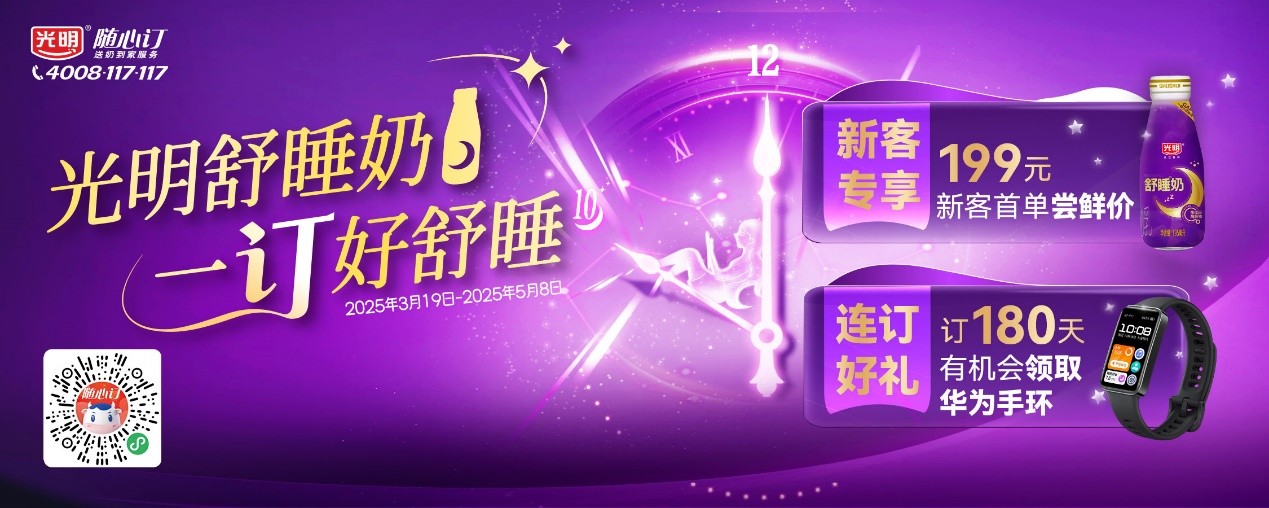 光明乳业推出了“7天舒睡挑战——失眠星人召集令”活动,并与鲸鸿动能合作,依托华为的全场景生态触点、光明随心订的微博和抖音账号、线下新鲜屋门店以及相关专场活动,同步招募10000人参与。活动将鼓励有睡眠困扰的用户持续饮用舒睡牛奶,亲身体验其助眠作用,并通过数据反哺机制,推动光明乳业的研发团队不断优化产品,为消费者提供更加科学、更加个性化的健康解决方案。在“超值尝鲜”福利中,消费者通过光明随心订,只要花9.9元,就能体验7日装舒睡奶;在“首单专享”活动中,新用户能获得尝鲜体验价,订购30天舒睡奶只要199元;而在“连订有礼”活动,消费者连续订购180天,就有机会获得华为手环。