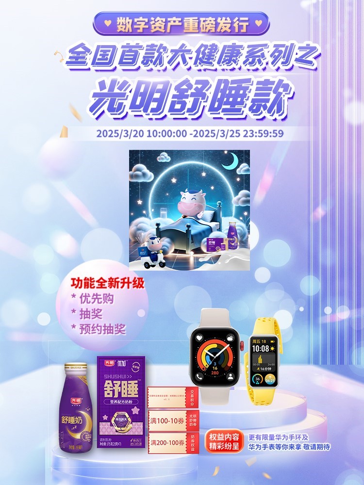 除此之外,在数字化浪潮汹涌澎湃的当下,光明乳业以行业先锋之姿,重磅推出全国首款大健康系列之光明舒睡款数字资产。光明随心订APP作为此次数字资产发行平台,全面焕新升级数字资产板块功能,为用户带来前所未有的沉浸式体验。本次数字资产权益非常丰富,包括了1元支付体验14天舒睡奶、每个季度末发放给持有用户光明舒睡奶满减券、限量华为手环以及华为手表等等,并且本次光明随心订APP数字资产板块功能全新升级,包括了发行历史项目部分用户空投、标杆项目优先购、光明随心订APP数字资产板块和官方社群抽奖优先购、预约抽签购买以及候补公售等等,各种与用户互动玩法精彩纷呈,诚意满满。这不仅是数字资产发行模式的突破,更是光明乳业引领行业创新发展的有力证明。