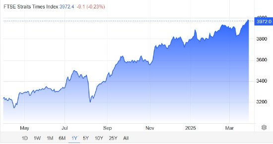新加坡股市小幅收低,可能因技术性回调,此前已连续四个交易日上涨。富时海峡时报指数收盘下跌0.2%,至3972.43点,盘中一度创下4005.18点的纪录高位。消费和房地产类股领跌,DFI零售集团下跌2.0%,泰国酿酒下跌1.0%。凯德投资下跌1.1%,香港置地下跌2.0%。新加坡交易所今日表现居前,上涨0.9%。在指数中权重较大的新加坡电信上涨0.9%。海峡时报指数今年迄今已累计上涨约5%。