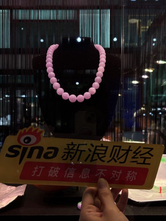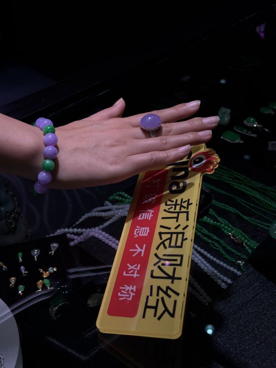 来自于佛山的玉老孃品牌展示了千万级粉色佳人紫罗兰珠串,标价1008万。现场,新浪财经试带了紫罗兰戒指和手串,整套售价达到88万。(闫妍)