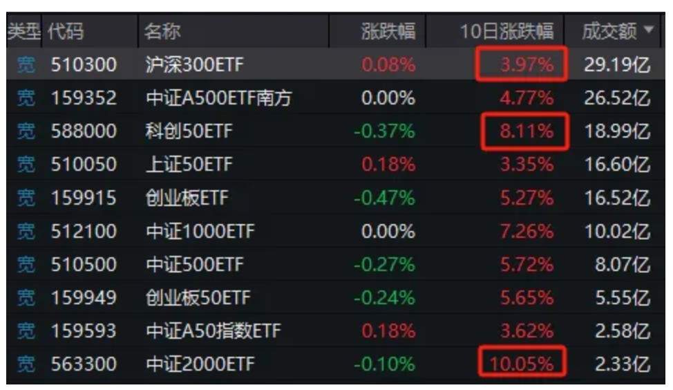 比如沪深300ETF(510300)与科创50ETF(588000),近10日涨幅分别为4%和8%,直接拉开一倍差距。中证2000ETF(563300)同期涨幅则更大,达到10%。