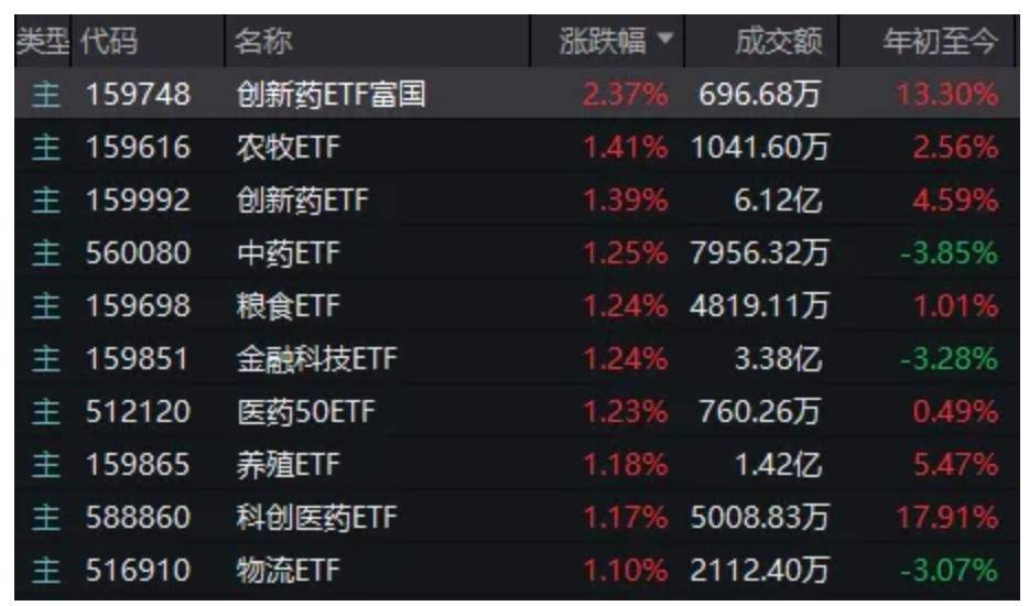 虽然自贸、物流等概念掀起涨停潮,但在场内ETF中,这些板块并未有太多体现;实际领涨的主要是创新药ETF、中药ETF等主题型产品,以及行业型产品中的医药ETF、医药卫生ETF。
