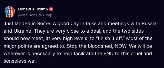 特朗普在Truth Social发帖表示,双方现在应当在“非常高层级”会面,以“完成这一进程”。